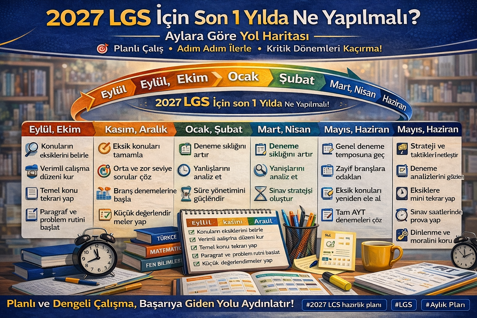 2027 LGS için son 1 yıl, doğru planlandığında öğrencinin seviyesini ciddi biçimde yükseltebilir. Bu süreçte her ayın, her dönemin ve her çalışma türünün farklı bir işlevi vardır. Yılın başında temel kuran, ortasında beceri geliştiren ve sonunda sınav pratiğini güçlendiren öğrenciler LGS’ye çok daha hazır girer. Önemli olan her gün kusursuz olmak değil, yıl boyunca bilinçli şekilde ilerlemektir.