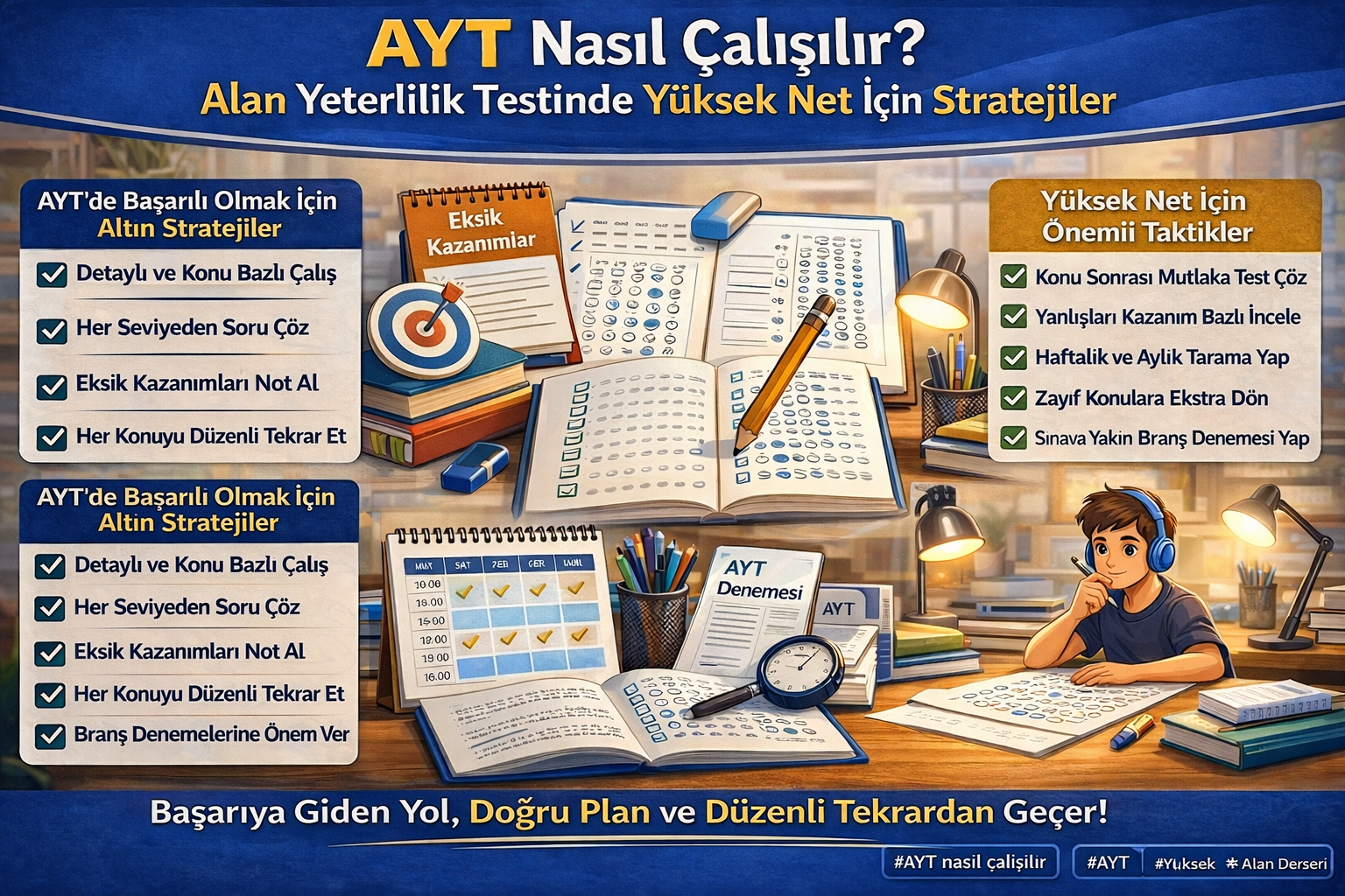 AYT çalışmak, sabır, plan ve tekrar isteyen bir süreçtir. Alan derslerinde yüksek net yapmak isteyen öğrenciler, konuları yüzeysel geçmek yerine derinlemesine öğrenmeli, düzenli tekrar yapmalı ve deneme analizini ihmal etmemelidir. AYT’de güçlü sonuçlar çoğu zaman birikimli ve disiplinli çalışmanın sonucudur.