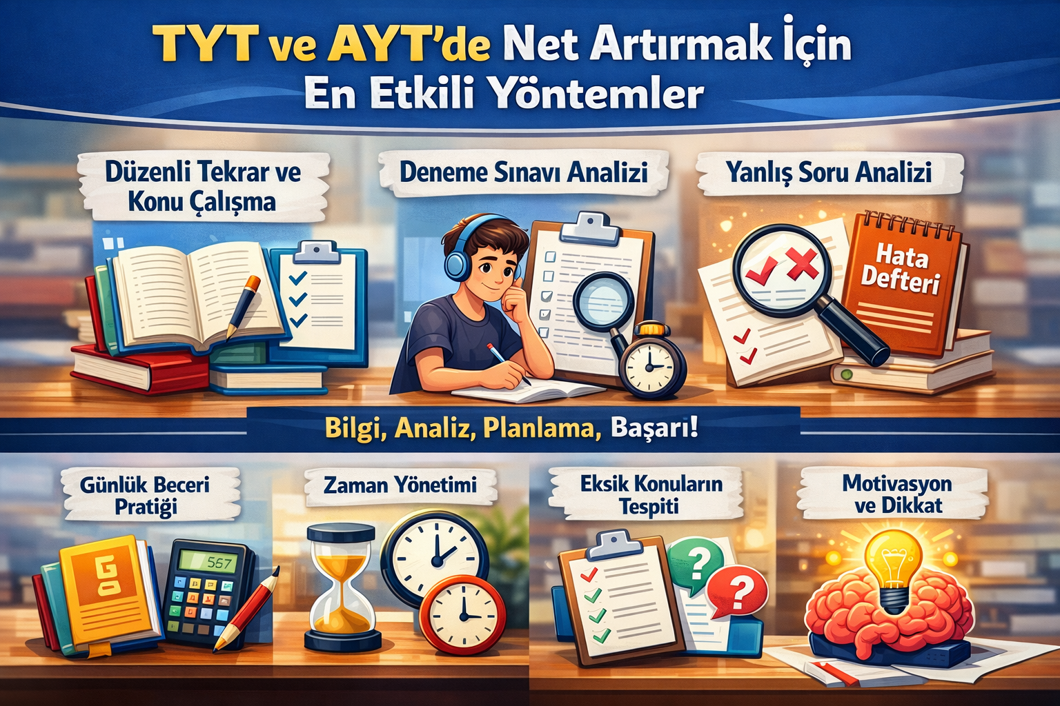 TYT ve AYT’de net artırmak, plansız yoğunluktan değil; bilinçli ve düzenli çalışmadan gelir. Günlük beceri pratiği, konu tekrarları, deneme analizi ve yanlış takibi birlikte yürütüldüğünde netler zamanla yükselir. Başarıyı getiren şey çok çalışmak kadar, doğru şeyi doğru şekilde çalışmaktır.